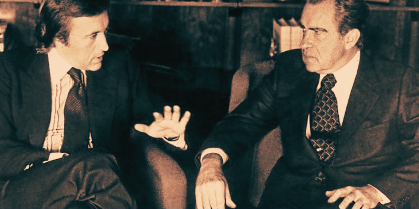 En 1977 el ex presidente Richard Nixon aceptó ser entrevistado por el periodista británico David Frost. Apenas habían pasado cinco años de los sucesos del Watergate —escándalo que lo obligó a renunciar al cargo, cuando quedó en evidencia que utilizó recursos del Estado para espiar al partido contrario— y este sería su primer encuentro con la prensa desde su dimisión en el salón oval.